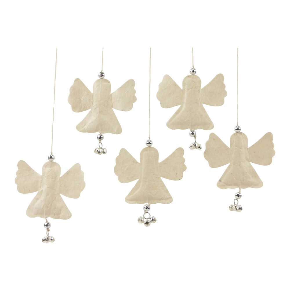 (Weihnachts-)Anhänger aus naturbelassenem Büttenpapier, mit silberfarbener Perle und Glöckchen, handgefertigt in Nepal