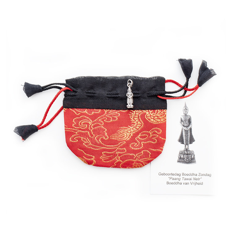 Geboortedag Boeddha hanger/bedel Zondag, massief 925 zilver, handgesmeed, incl. kaartje met uitleg in het Nederlands en Engels, brokaten opbergzakje en cadeauverpakking van handgeschept papier